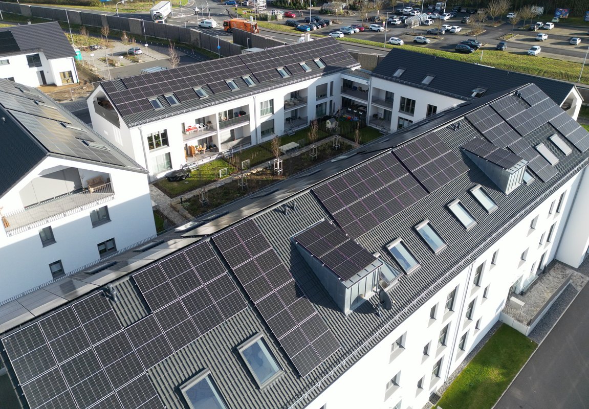 Auf den Dächern der vier Gebäude hat DIE ENERGIE rund 400 Solarmodule installiert, die gemeinsam eine Leistung von etwa 180 Kilowattpeak erreichen. Damit über den Tag verteilt möglichst viel des Strombedarfs direkt vor Ort gedeckt wird, sind die Module nicht nur nach Süden, sondern auch nach Osten und Westen ausgerichtet. Die erzeugte Energie kommt direkt den 41 Wohnungen zugute, denn die Bewohner können den erzeugten Ökostrom unmittelbar nutzen.